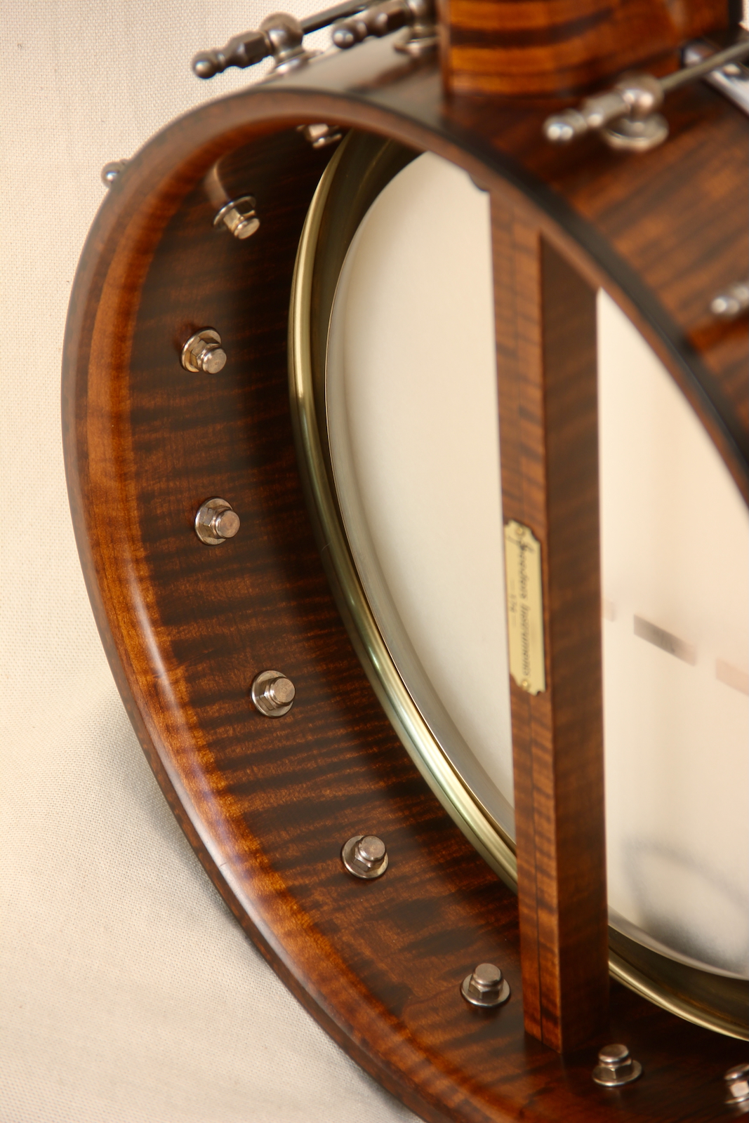 The Dobson Special banjos have a powerful well rounded tone with a comfortable neck profile ideal for all hand sizes and comfort while playing all over the neck. The Dobson Special utilizes a Dobson tone ring mounted on a rolled brass ring to isolate the tone ring from the wooden rim giving it a unique and powerful Dobson sound with more balanced and a crisp overall tone. It’s simple but elegant inlays and overall design has a vintage inspired look while adding modern play ability and durability.