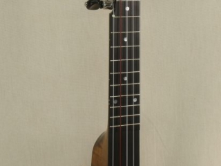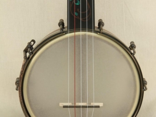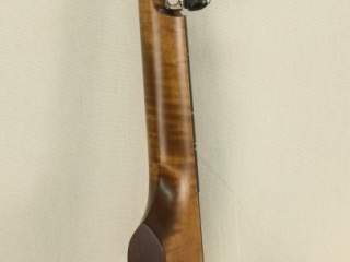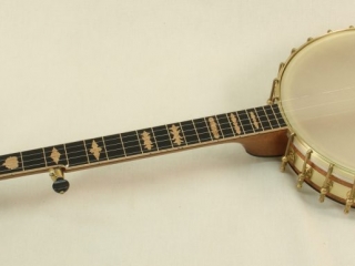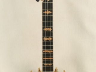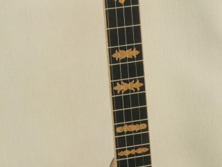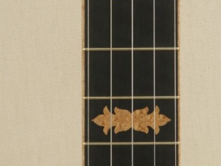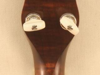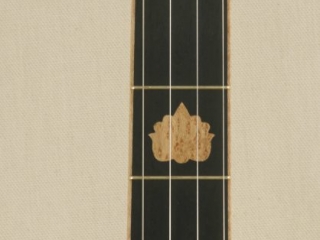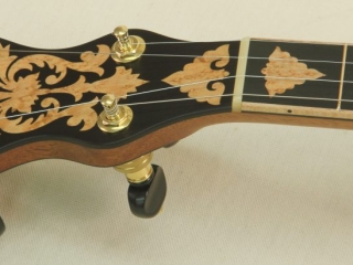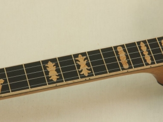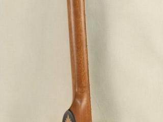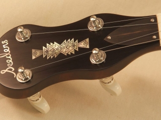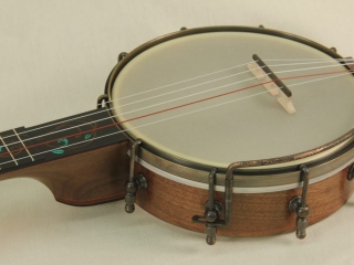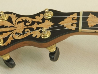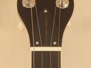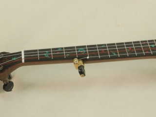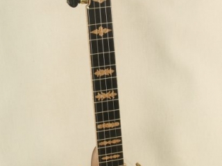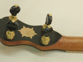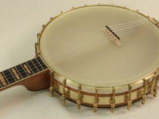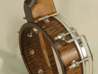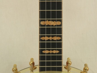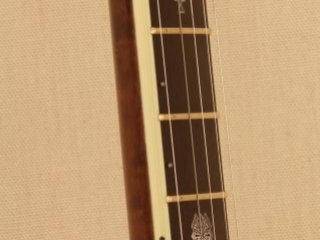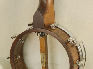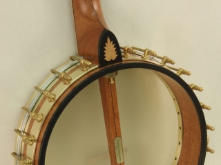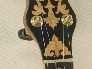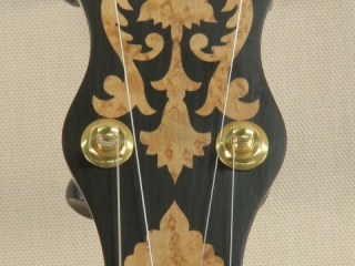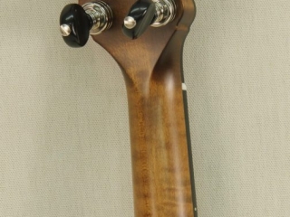 An elegant but simply adorned Curly Maple piccolo banjo. Stained with a golden brown finish with hand engraved Mother of Pearl inlays.