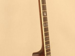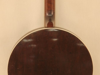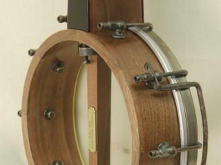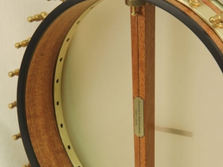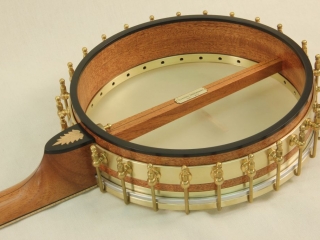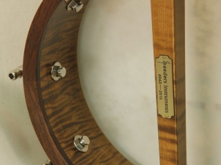 This custom banjo is designed around the classic Vega Tubaphone No. 9. The engraved mother of pearl inlays, found on the original model, were simplified and replaced with tightly figured Birdseye Maple for a simplified but elegant look. The Ivoroid binding was replaced using Curly Maple. Unlike the original maple rim this rim was built using Mahogany to match the neck and extra rim depth was added.