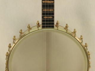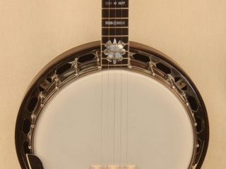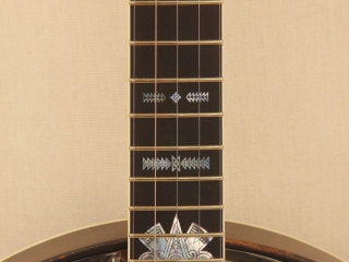 This banjo started its life as a 1926 Gibson TB-1 tenor banjo. I converted it to a TB-2 Style Pyramid Tone Ring banjo with a very unique custom inlay theme. The Pyramid Tone Ring is a reproduction ring made by Arnold Clayton fitted to the original rim. The flange has been upgraded from the TB-1 Diamond Flange to an original TB-2 hex flange.