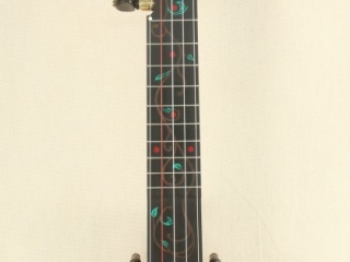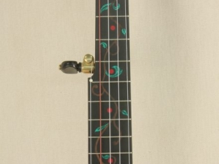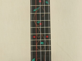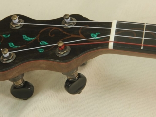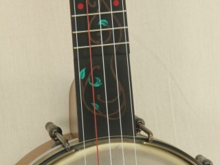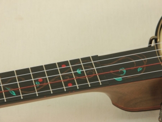A Walnut Piccolo banjo with a custom vine inlay. The inlay is made from Rosewood with engraved recon stone leaves. Red veneer details match the recon stone dot inlays.