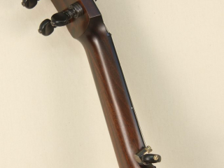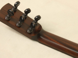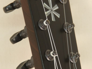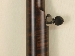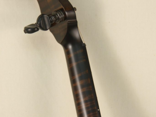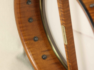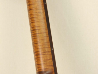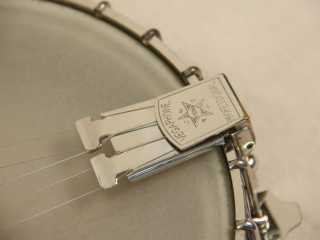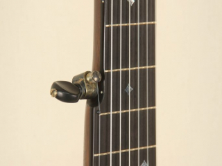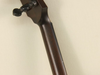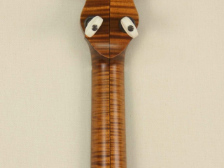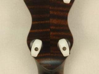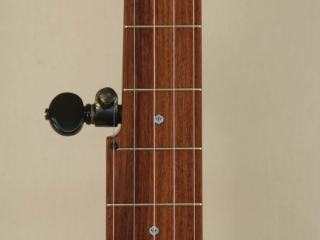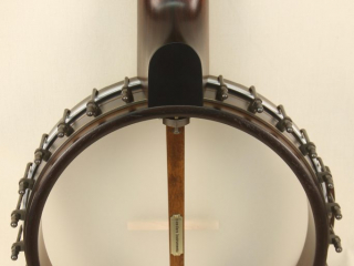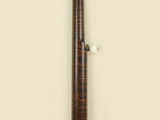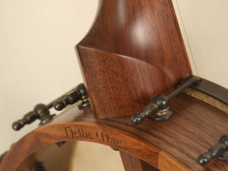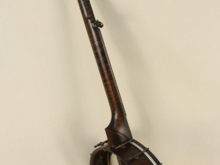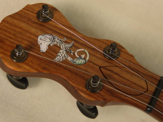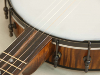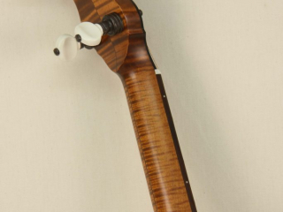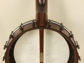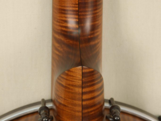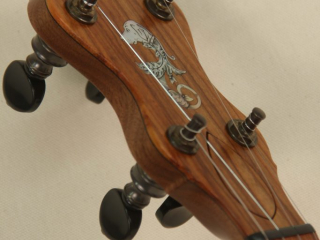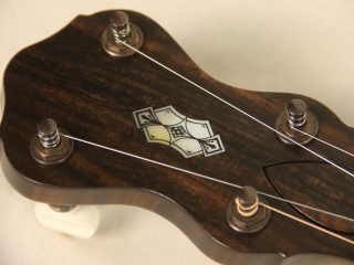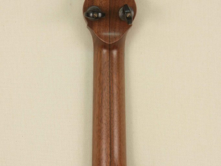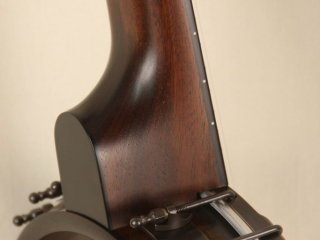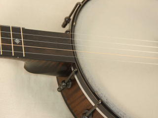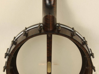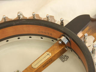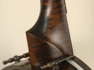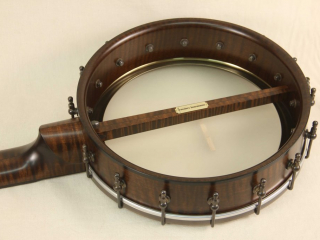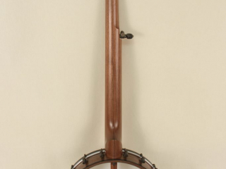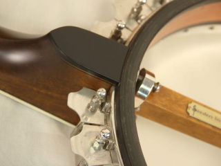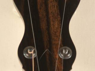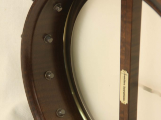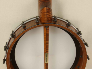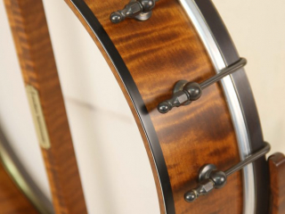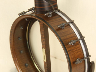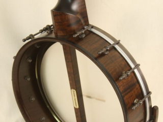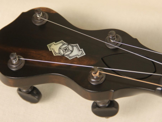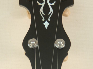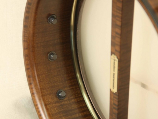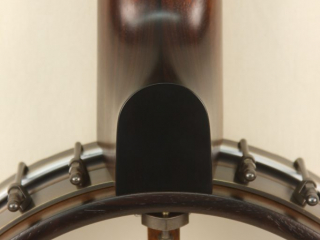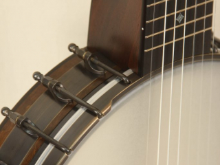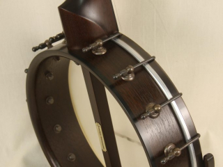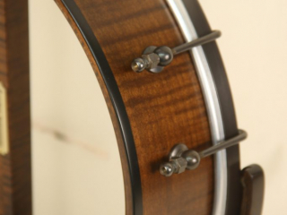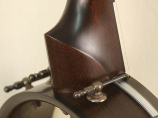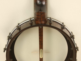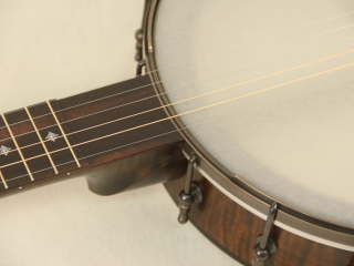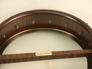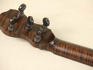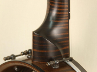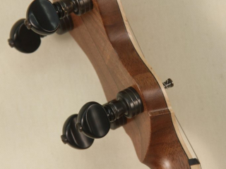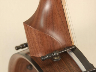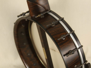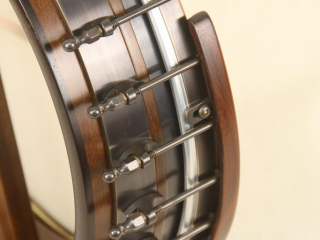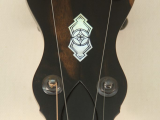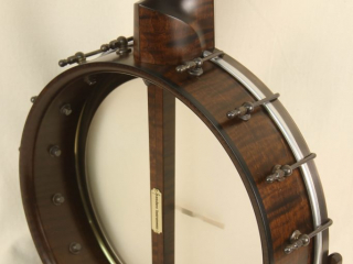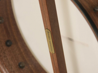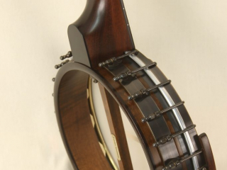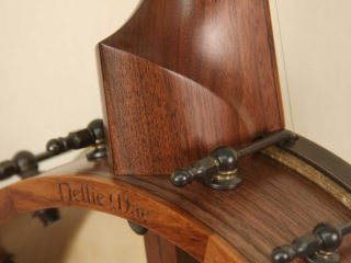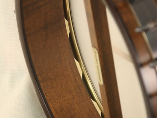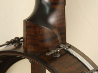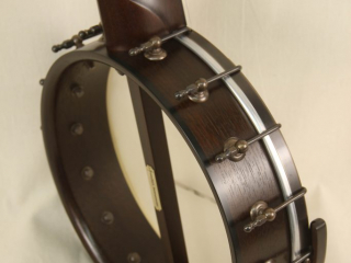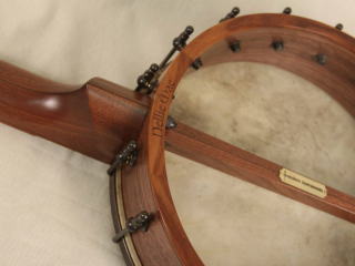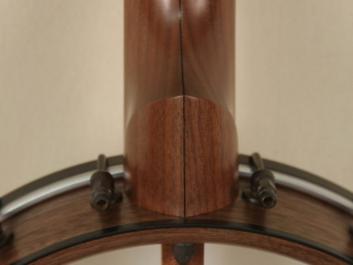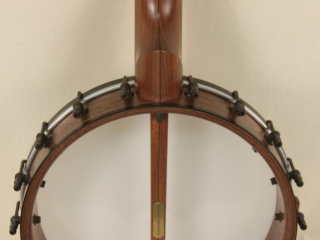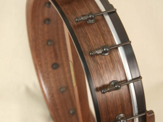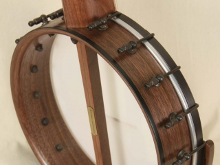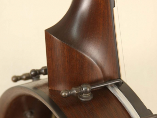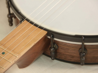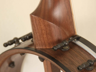 This Walnut banjos features the Seeders asymmetrical peghead design and some simple but elegant details. The tone ring is a hollow brass tube that is similar in sound to a regular rolled brass tone ring but has a little something extra to it because of the added size and mass.