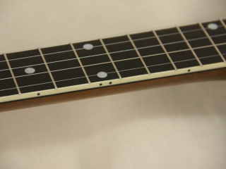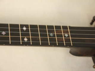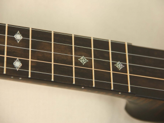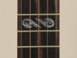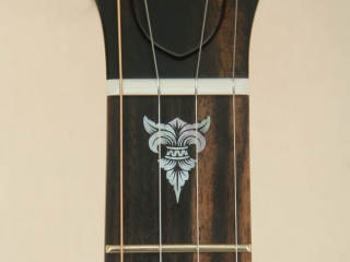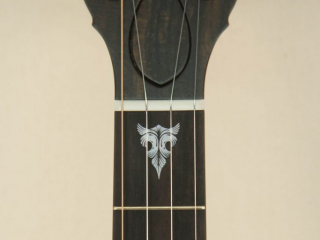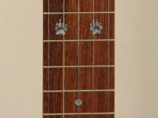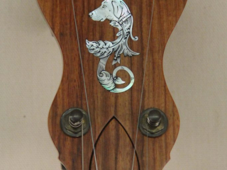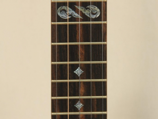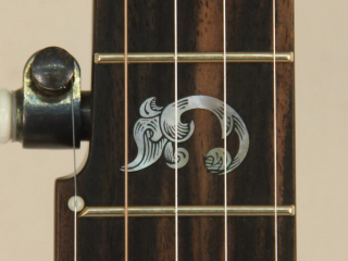I’ve done a number of dog memorializing influenced inlays over the years but this is one of my favorites. Taking the classic Fairbanks lion griffin inlay and adding the profile of the owners own dog I came up with this fun whimsical spin on a classic inlay. The peghead and fretboard are Grenadillo wood to reference the reddish brown color of “Nellie Mae”, the dog who’s name and profile adorn the banjo.