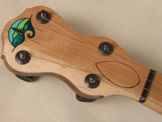 This banjo was made for a raffle at the 2022 Green Mountain Bluegrass Festival. It features a Vermont hardwood fingerboard and custom inlays depicting the logo of the festival.