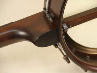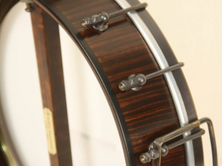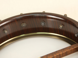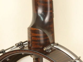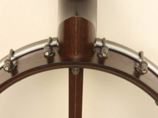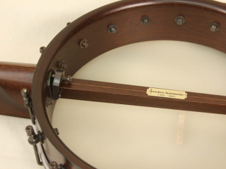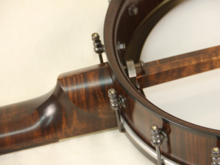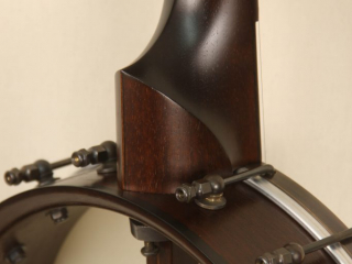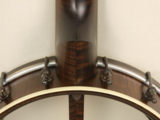 This banjo is one of the first to feature an exciting new piece of hardware unique to Seeders Instruments. A new neck attachment hardware that is designed and manufactured in house that allows for a bolt on neck assembly but keeps the look and placement of a traditional dowel stick. It also adds rigidity to the rim and neck joint area making for a more secure, solid, and balanced tension neck attachment. The design supports the rim above the dowel stick much more than the traditional U style yoke and pin and looks great doing so as well!