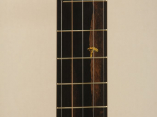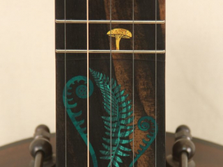 This custom Dobson Special features Mahogany and some playful custom inlays inspired by the woods and trails of the Pacific Northwest. Mushrooms and a feather as fret markers, ferns in the scoop, and mountains and a trail on the peghead under a starry sky. The combination of Mahogany, the 12″ Dobson Special tone ring and a Fiberskyn head make for a wonderfully plunky and warm tone. This banjo was made for the wonderfully talented Kendl Winter of The Lowest Pair. Don’t miss a chance to see or hear her play it!