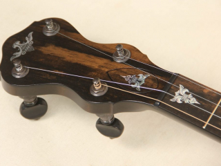 This Curly Maple and Ebony banjo features an 11-5/8″ rim. A Unique size to Seeders Instruments giving the banjo a little more low end without it getting too muddy while retaining some of the great clarity of an 11″. An excellent balance between 11″ and 12″ rims. This model features Ebony appointments and hand engraved mother of pearl inlays.