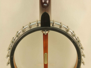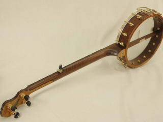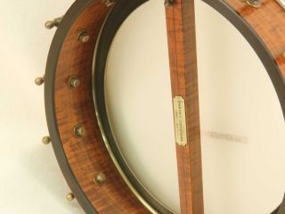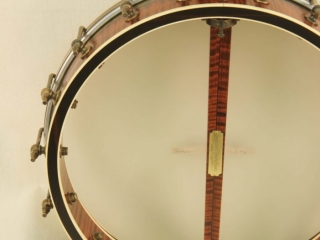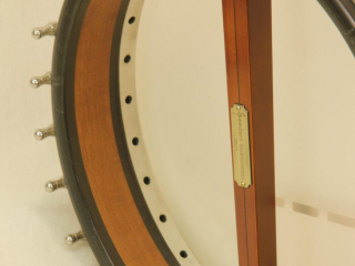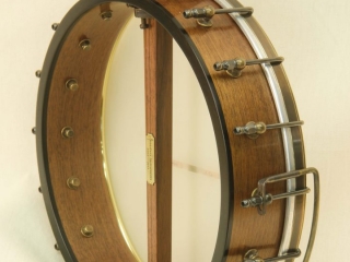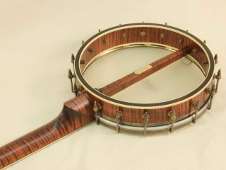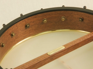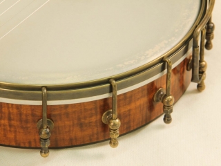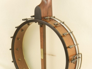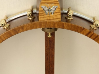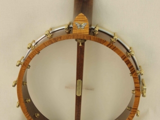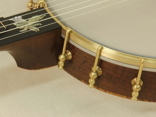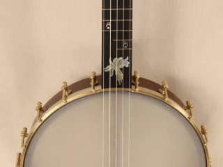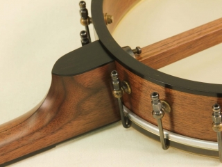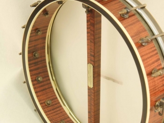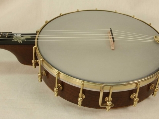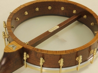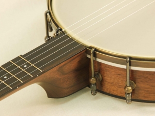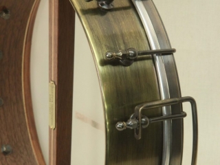 This slot head banjo features a brass and Walnut half spun over rim with a Walnut neck and Maple accent veneers. The rim features a deep brass clad exterior topped and Walnut internal rim with a Bubinga tone ring. The unique design of this banjo gives it a eye catching look and has an incredibly well rounded sound to match.