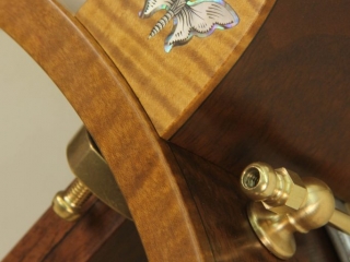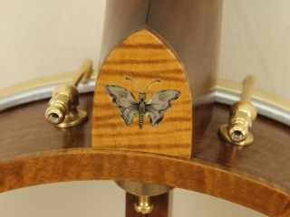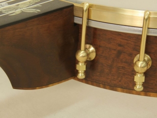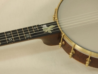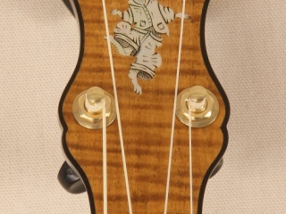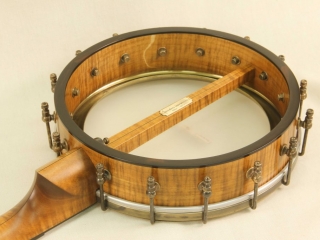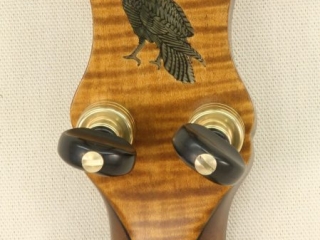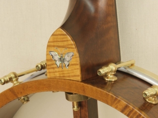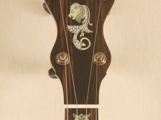 This banjo is loosely based on early the golden age of Fairbanks and Fairbanks and Cole banjos. I redesigned the classic lion head griffin giving it a more fierce and lion like head. Using the original inlay patterns I created my own engravings giving it a traditional but more refined look. The curly maple 12″ rim features a Whyte Laydie tone ring with ivoroid binding and antiqued raw brass hardware. The tone from the 12″ Whyte Laydie is deep and precise. Paired with the elegant looks this is one of the finest of banjos available from Seeders Instruments.