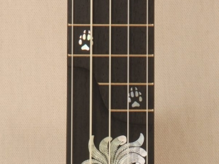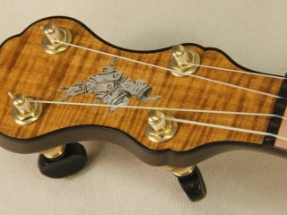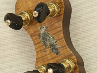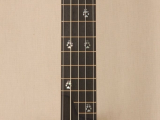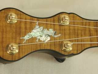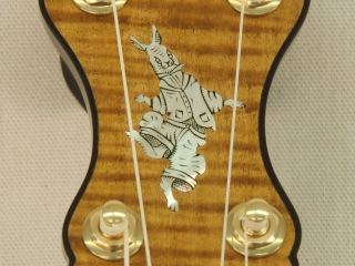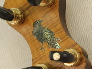This banjo features some of my favorite inlay and engraving work yet. The unique folklore trickster theme led us to make some very fun decisions that tied everything together very nicely in a personal and cohesive way. We started with B’rer Rabbit on the peghead and the Japanese Kitsunev, a nine tailed fox, in the scoop with fox prints traveling up the fingerboard. We later added a raven to the back of the peghead and lastly a butterfly to the heel. The connection of the two is as follows, “in the Canadian Pacific northwest, the Haida depict Butterfly as the companion of Raven the Creator-Trickster, perhaps acknowledging the unpredictable and unreliable nature of “flights of fancy” and dreaming”. The copper of the half fretless overlay with brass screws led to the use of copper and brass side location dots as well as the raw brass hardware. Overall a very fun and playful but elegant design resulted.