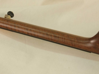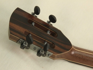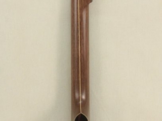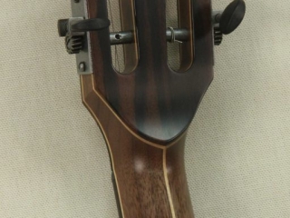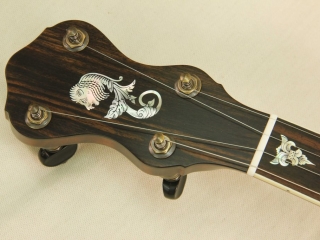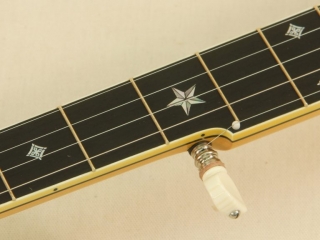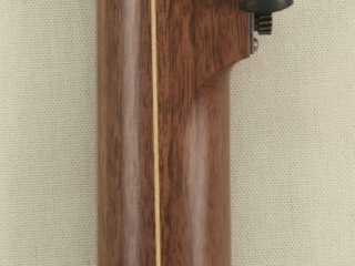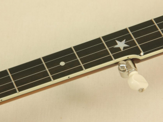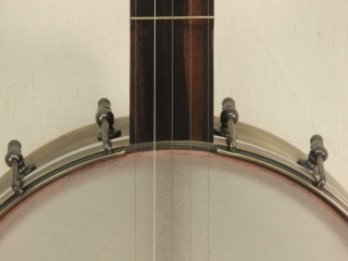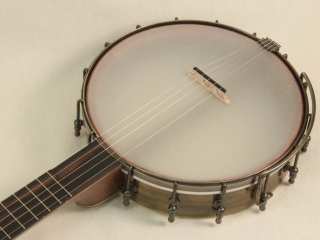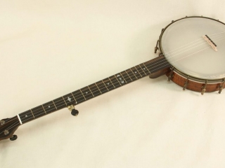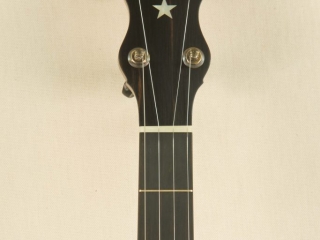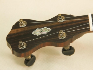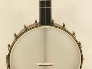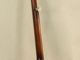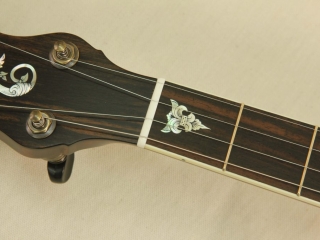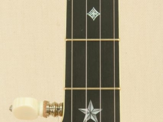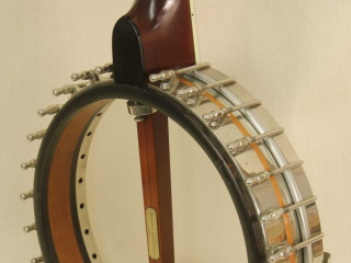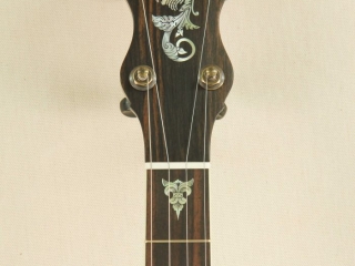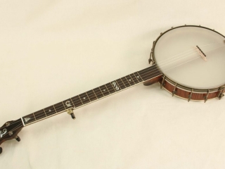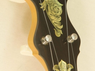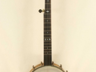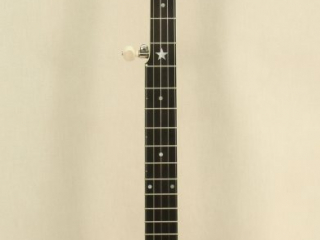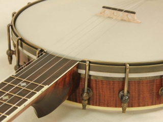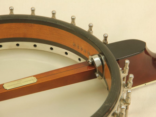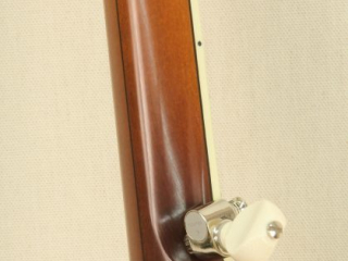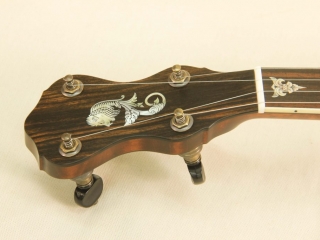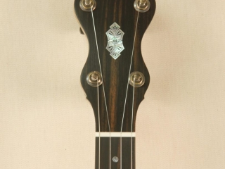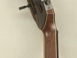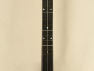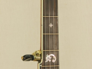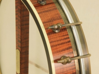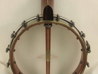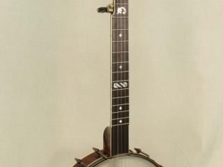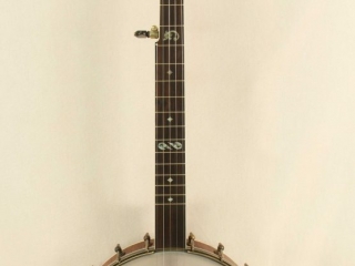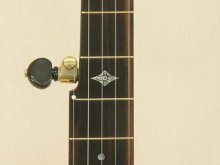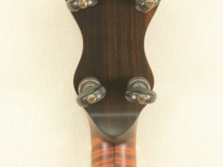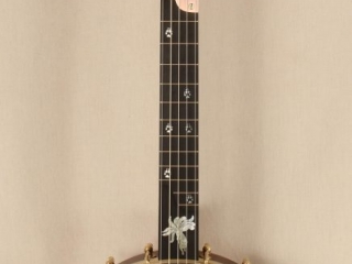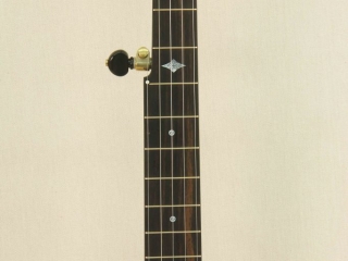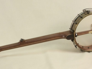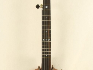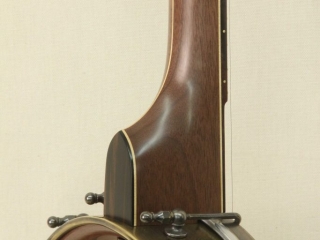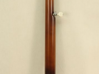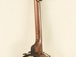 This slothead banjo features a brass and Walnut half spun over rim with a Walnut neck. The unique slotted fifth string tuner is located on the 7th fret, a detail often found on some original Dobson banjos. Because of the extra mass of the slotted fifth string tuner area this gives the player plenty of room below it for more comfortable playing. The rim features a deep brass clad exterior topped with a Bubinga tone ring. The unique design of this banjo gives it a eye catching look and has an incredibly well rounded sound to match.