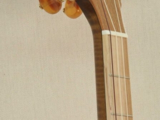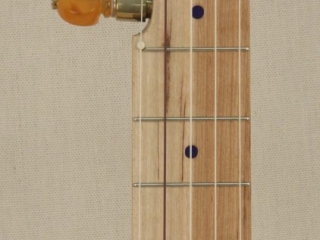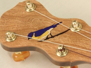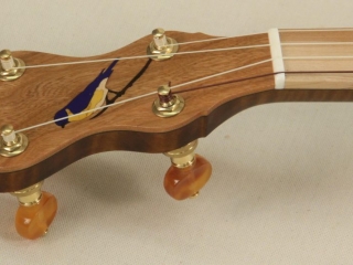 A custom Curly Maple, Cherry, and Ironwood banjo that features custom blue fretboard inlays with accompanying bluebird inlay. The 10 1/2″ rim delivers a focused tone while being more comfortable for a smaller person or someone desiring a more compact feel.